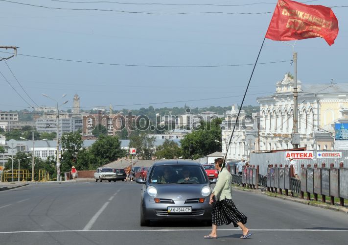 Учасниця акції протесту проти демонтажу монумента на честь проголошення радянської влади в Україні на площі Конституції несе прапор, переходячи дорогу в Харкові, у четвер, 28 липня 2011 р. У цей день ветеранська організація "Союз радянських офіцерів" та громадська організація "Трудова Харківщина" провели пікет проти знесення пам'ятника. Монумент на честь проголошення радянської влади в Україні буде реконструйовано і перенесено у віддалений промисловий район міста. На місці монумента на площі Конституції буде встановлений пам'ятник «Летюча Україна». На думку вдови скульптора і співавтора пам'ятника Михайла Овсянкіна - монумент не переживе транспортування. Він з граніту, до того ж, в основі фундаменту - монолітна плита, яка не дає вібраціям метрополітену зруйнувати пам'ятник. Фото Володимира Андрєєва / УНІАН