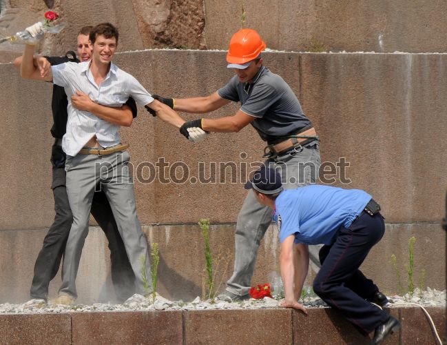 Учасник акції протесту проти демонтажу монумента на честь проголошення радянської влади в Україні на площі Конституції, утримуваний робітниками і охороною, намагається покласти квіти до пам'ятника, в Харкові, у четвер, 28 липня 2011 р. У цей день ветеранська організація "Союз радянських офіцерів" та громадська організація "Трудова Харківщина" провели пікет проти знесення пам'ятника. Монумент на честь проголошення радянської влади в Україні буде реконструйовано і перенесено у віддалений промисловий район міста. На місці монумента на площі Конституції буде встановлений пам'ятник «Летюча Україна». На думку вдови скульптора і співавтора пам'ятника Михайла Овсянкіна - монумент не переживе транспортування. Він з граніту, до того ж, в основі фундаменту - монолітна плита, яка не дає вібраціям метрополітену зруйнувати пам'ятник. Фото Володимира Андрєєва / УНІАН