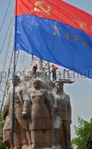 Робочі проводять роботи по демонтажу монумента на честь проголошення радянської влади в Україні на площі Конституції, в Харкові, в четвер, 28 липня 2011 р. У цей день ветеранська організація "Союз радянських офіцерів" та громадська організація "Трудова Харківщина" провели пікет проти знесення пам'ятника. Монумент на честь проголошення радянської влади в Україні буде реконструйовано і перенесено у віддалений промисловий район міста. На місці монумента на площі Конституції буде встановлений пам'ятник «Летюча Україна». На думку вдови скульптора і співавтора пам'ятника Михайла Овсянкіна - монумент не переживе транспортування. Він з граніту, до того ж, в основі фундаменту - монолітна плита, яка не дає вібраціям метрополітену зруйнувати пам'ятник. Фото Володимира Андрєєва / УНІАН