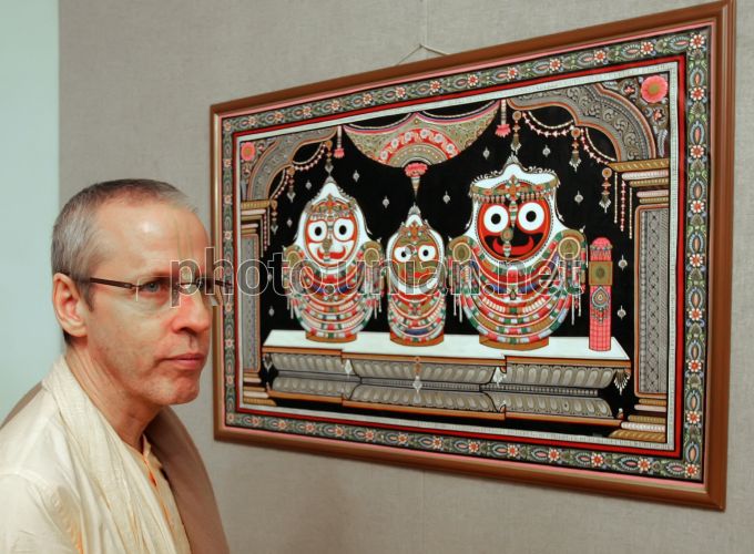Американський філософ, письменник, видавець, музикант, вчитель Крішна-концепції Бхакті Судхір Госвамі, котрий приживає вже 30 років в Індії, знайомиться з виставкою "Загадкова Індія" під час пресс-відкриття, в Києві, в середу, 3 серпня 2011 р. Унікальна виставка відкривається 4-го і триватиме до 7-го серпня. На виставці будуть представлені рідкісні літературні пам'ятки, стародавні манускрипти, класичний живопис, роботи відомих фотографів, 3D-інсталяції, присвячені Індії. Більшість експонатів надані відомим українським колекціонером, меценатом і мандрівником Тімом Самарою. Понад 30 картин належать до Оріської та Раджастанської шкіл живопису, сюжети яких розкривають індійську міфологію і найдавніші епоси - «Махабхарату», «Рамаяну», «Пурані». Фото Олександра Синиці / УНІАН