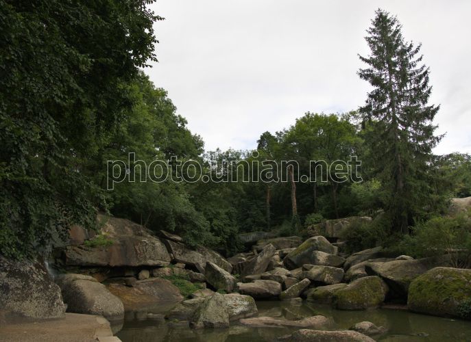 Камені на річці в Національному дендрологічному парку «Софіївка», в м. Умань (Черкаської обл.), у четвер, 4 серпня 2011 р. Парк «Софіївка» є пам'ятником краєвидного типу світового садово-паркового мистецтва кінця XVIII — першої половини XIX ст. Тут росте понад 2000 видів дерев і кущів (місцевих і екзотичних). Парк «Софіївка» заснований у 1796 році власником Умані Станіславом Потоцьким та названий на честь його дружини Софії Вітт-Потоцької. За задумом архітектора, парк є наочною ілюстрацією до окремих частин поем Гомера «Іліада» та «Одіссея». В основу композиційного рішення центральної частини парку покладені сюжети з міфології Стародавньої Греції та Риму, а деякі місця нагадують оселю грецьких богів, героїв, письменників та філософів. Фото Олексія Чернишова / УНІАН