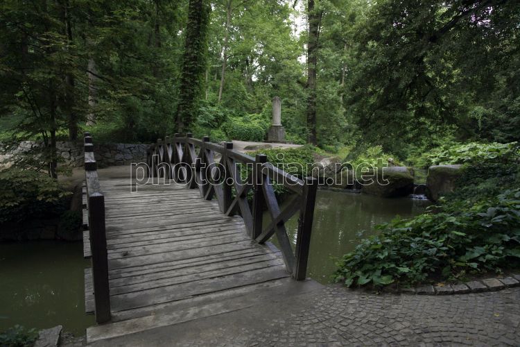 Дерев'яний міст, праворучна задньому плані - гранітний обеліск «Усічена колона» в Національному дендрологічному парку «Софіївка», в м. Умань (Черкаської обл.), у четвер, 4 серпня 2011 р. Парк «Софіївка» є пам'ятником краєвидного типу світового садово-паркового мистецтва кінця XVIII — першої половини XIX ст. Тут росте понад 2000 видів дерев і кущів (місцевих і екзотичних). Парк «Софіївка» заснований у 1796 році власником Умані Станіславом Потоцьким та названий на честь його дружини Софії Вітт-Потоцької. За задумом архітектора, парк є наочною ілюстрацією до окремих частин поем Гомера «Іліада» та «Одіссея». В основу композиційного рішення центральної частини парку покладені сюжети з міфології Стародавньої Греції та Риму, а деякі місця нагадують оселю грецьких богів, героїв, письменників та філософів. Фото Олексія Чернишова / УНІАН