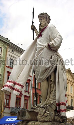 Статуя Нептуна, одягнена у вишиванку, в центрі Львова, у вівторок, 23 серпня 2011 р. Цього дня у Львові відзначили Свято вишиванки. У вишивані сорочки одягнули скульптури-фонтани в центрі міста. Також влада закликала львів'ян одягнути цього дня національні вбрання. Акція була присвячена до Дня Державного Прапора України, який відзначається щорічно 23 серпня. Фото Вадима Голуба / УНІАН
