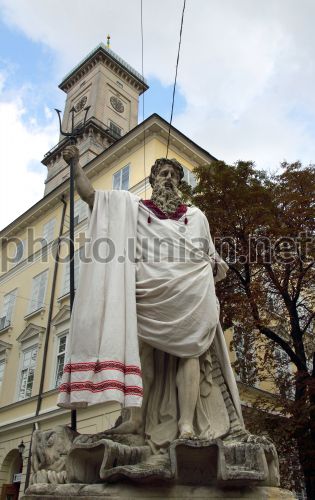 Статуя Нептуна, одягнена у вишиванку, в центрі Львова, у вівторок, 23 серпня 2011 р. Цього дня у Львові відзначили Свято вишиванки. У вишивані сорочки одягнули скульптури-фонтани в центрі міста. Також влада закликала львів'ян одягнути цього дня національні вбрання. Акція була присвячена до Дня Державного Прапора України, який відзначається щорічно 23 серпня. Фото Вадима Голуба / УНІАН