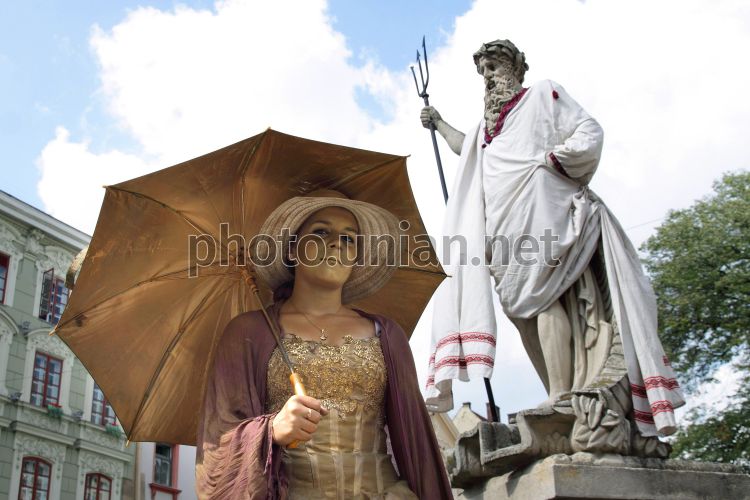 Акторка, яка зображає живу скульптуру, біля статуї Нептуна, одягненої у вишиванку, в центрі Львова, у вівторок, 23 серпня 2011 р. Цього дня у Львові відзначили Свято вишиванки. У вишивані сорочки одягнули скульптури-фонтани в центрі міста. Також влада закликала львів'ян одягнути цього дня національні вбрання. Акція була присвячена до Дня Державного Прапора України, який відзначається щорічно 23 серпня. Фото Вадима Голуба / УНІАН
