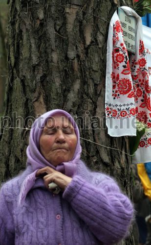 COMM Літня жінка під час церемонії вшановування пам'яті жертв тоталітарного режиму, які були розстріляні в Биківнянському лісі у 1938 р., на території Державного історико-меморіального заповідника "Биковнянськіє могили" під Києвом в неділю, 21 травня 2006 р. У церемонії взяв участь Президент України Віктор Ющенко. У своєму виступі Глава держави відзначив, що трагедія Биківні стоїть в одному ряду з такими злочинами як Освенцим, Бухенвальд або Дахау. Фото УНІАН