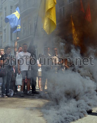 Димова шашка під час акції Комітету визволення політв’язнів проти протиправних дій силових структур під Адміністрацією Президента, в Києві, у середу, 31 серпня 2011 р. Цього дня біля Адміністрації Президента України Комітет визволення політв’язнів провів акцію проти протиправних дій силових структур. В акції взяли участь близько 100 осіб, які намагались передати Президенту України білу коробку із написом «Вогненебезпечно», у якій були яйця та вінок. На думку організаторів акції, саме цих речей «боїться Президент». Крім того, учасники акції запалили біля воріт Адміністрації Президента димову шашку. В результаті правоохоронні органи склали адміністративний протокол щодо одного з організаторів цієї акції Миколи Коханівського. Також учасники акції оприлюднили звернення до громадських організацій, політичних партій та небайдужих громадян із закликом підтримати захист тих людей, які не бояться виступати проти діючої влади. Фото Олега Петрасюка / УНІАН