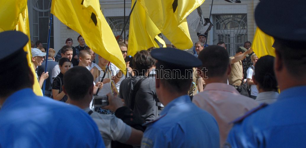 Співробітники міліції стежать за порядком під час акції Комітету звільнення політв'язнів проти протиправних дій силових структур під Адміністрацією Президента, в Києві, у середу, 31 серпня 2011 р. Цього дня біля Адміністрації Президента України Комітет визволення політв’язнів провів акцію проти протиправних дій силових структур. В акції взяли участь близько 100 осіб, які намагались передати Президенту України білу коробку із написом «Вогненебезпечно», у якій були яйця та вінок. На думку організаторів акції, саме цих речей «боїться Президент». Крім того, учасники акції запалили біля воріт Адміністрації Президента димову шашку. В результаті правоохоронні органи склали адміністративний протокол щодо одного з організаторів цієї акції Миколи Коханівського. Також учасники акції оприлюднили звернення до громадських організацій, політичних партій та небайдужих громадян із закликом підтримати захист тих людей, які не бояться виступати проти діючої влади. Фото Олега Петрасюка / УНІАН