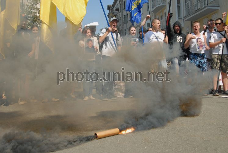 Димова шашка під час акції Комітету визволення політв’язнів проти протиправних дій силових структур під Адміністрацією Президента, в Києві, у середу, 31 серпня 2011 р. Цього дня біля Адміністрації Президента України Комітет визволення політв’язнів провів акцію проти протиправних дій силових структур. В акції взяли участь близько 100 осіб, які намагались передати Президенту України білу коробку із написом «Вогненебезпечно», у якій були яйця та вінок. На думку організаторів акції, саме цих речей «боїться Президент». Крім того, учасники акції запалили біля воріт Адміністрації Президента димову шашку. В результаті правоохоронні органи склали адміністративний протокол щодо одного з організаторів цієї акції Миколи Коханівського. Також учасники акції оприлюднили звернення до громадських організацій, політичних партій та небайдужих громадян із закликом підтримати захист тих людей, які не бояться виступати проти діючої влади. Фото Олега Петрасюка / УНІАН