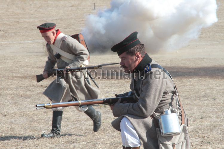 Учасники військово-історичної реконструкції, присвяченої Альмінському бою, в селі Віліно (Бахчисарайський район, Крим), в неділю, 25 вересня 2011р. Реконструкція бою проходила на березі річки Альма. На полі Альмінської битви відбулася битва-провісниця героїчної Севастопольської жнив. Саме на Альмінському полі вперше схрестили багнети російські та британські війська. Альмінська битва - це перша велика битва Кримської війни 1853 - 1856 років. Вона відбулася у вересні 1854 року між військами коаліції Великобританії, Франції та Туреччини з одного боку, і Росії - з іншого. Перемогу в Альмінській битві отримали війська коаліції. Фото Олексія Сувірова / УНІАН