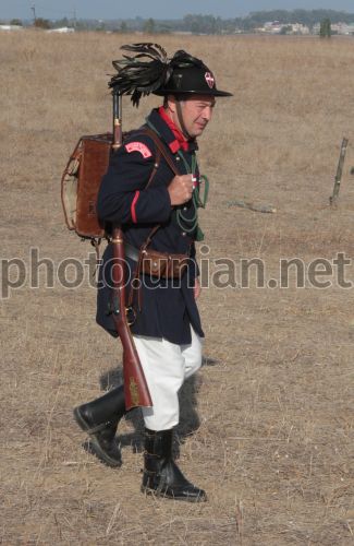 Учасники військово-історичної реконструкції, присвяченої Альмінському бою, в селі Віліно (Бахчисарайський район, Крим), в неділю, 25 вересня 2011р. Реконструкція бою проходила на березі річки Альма. На полі Альмінської битви відбулася битва-провісниця героїчної Севастопольської жнив. Саме на Альмінському полі вперше схрестили багнети російські та британські війська. Альмінська битва - це перша велика битва Кримської війни 1853 - 1856 років. Вона відбулася у вересні 1854 року між військами коаліції Великобританії, Франції та Туреччини з одного боку, і Росії - з іншого. Перемогу в Альмінській битві отримали війська коаліції. Фото Олексія Сувірова / УНІАН
