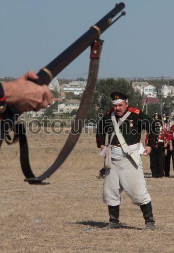 Учасники військово-історичної реконструкції, присвяченої Альмінському бою, в селі Віліно (Бахчисарайський район, Крим), в неділю, 25 вересня 2011р. Реконструкція бою проходила на березі річки Альма. На полі Альмінської битви відбулася битва-провісниця героїчної Севастопольської жнив. Саме на Альмінському полі вперше схрестили багнети російські та британські війська. Альмінська битва - це перша велика битва Кримської війни 1853 - 1856 років. Вона відбулася у вересні 1854 року між військами коаліції Великобританії, Франції та Туреччини з одного боку, і Росії - з іншого. Перемогу в Альмінській битві отримали війська коаліції. Фото Олексія Сувірова / УНІАН