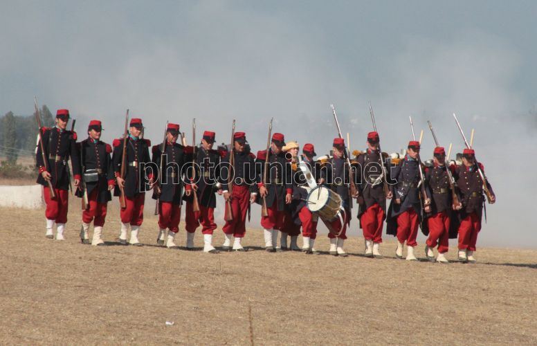Учасники військово-історичної реконструкції, присвяченої Альмінському бою, в селі Віліно (Бахчисарайський район, Крим), в неділю, 25 вересня 2011р. Реконструкція бою проходила на березі річки Альма. На полі Альмінської битви відбулася битва-провісниця героїчної Севастопольської жнив. Саме на Альмінському полі вперше схрестили багнети російські та британські війська. Альмінська битва - це перша велика битва Кримської війни 1853 - 1856 років. Вона відбулася у вересні 1854 року між військами коаліції Великобританії, Франції та Туреччини з одного боку, і Росії - з іншого. Перемогу в Альмінській битві отримали війська коаліції. Фото Олексія Сувірова / УНІАН