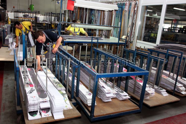 Працівники Українсько-австрійського підприємства ТОВ "Фішер-Мукачево" розкладають наклейки для декору лиж в одному з цехів заводу, в Мукачеві (Закарпатська обл.), у вівторок, 27 вересня 2011 р. ТОВ "Фішер-Мукачево" - високотехнологічне і найсучасніше в галузі підприємство з виробництва гірських і бігових лиж, хокейних ключок і т.п. Компанія експортує продукцію більш ніж в 20 країн і забезпечує, в окремих сегментах ринку, 60% її світового обігу. Географія реалізації виготовлених в Мукачеві товарів розповсюджується на Росію, Північну Америку, Західну і Східну Європу, Скандинавські країни, Японію і Корею. На підприємстві роботою забезпечено 1200 осіб. Фото Яноша Немеша / УНІАН