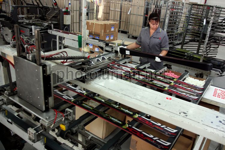 Працівниця Українсько-австрійського підприємства ТОВ "Фішер-Мукачево" знімає з конвеєру готові лижі в одному з цехів заводу, в Мукачеві (Закарпатська обл.), у вівторок, 27 вересня 2011 р. ТОВ "Фішер-Мукачево" - високотехнологічне і найсучасніше в галузі підприємство з виробництва гірських і бігових лиж, хокейних ключок і т.п. Компанія експортує продукцію більш ніж в 20 країн і забезпечує, в окремих сегментах ринку, 60% її світового обігу. Географія реалізації виготовлених в Мукачеві товарів розповсюджується на Росію, Північну Америку, Західну і Східну Європу, Скандинавські країни, Японію і Корею. На підприємстві роботою забезпечено 1200 осіб. Фото Яноша Немеша / УНІАН