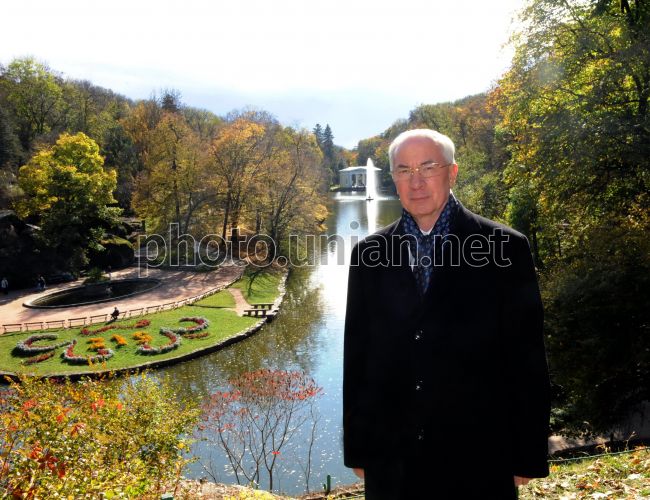 Прем'єр-міністр України Микола Азаров на території Національного дендрологічного парку України «Софіївка» в місті Умань (Черкаська область), в п'ятницю, 14 жовтня 2011 р. Під час відвідування парку «Софіївка» Азаров підтримав ініціативу черкаської влади про розвиток туристичної інфраструктури Умані. У цей день глава уряду здійснив робочу поїздку до міста Умань Черкаської області. Тут з нагоди свята Покрови Азаров відвідав Свято-Миколаївський собор, побував в гостях у свідків трагедії Бабиного Яру, оглянув загальноосвітню школу № 11 і районну лікарню, а також відвідав Національний дендрологічний парк України «Софіївка». Фото Олега Маркевича / POOL / УНІАН