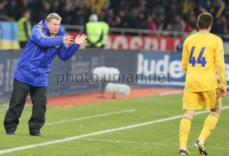 Головний тренер Національної збірної України з футболу Олег Блохін, ліворуч, дає вказівки півзахиснику Збірної Ярославу Ракицькому (№44) під час товариського матчу між збірними України і Німеччини на НСК "Олімпійський" у Києві, у п'ятницю, 11 листопада 2011 р. Матч закінчився внічию з рахунком 3:3. Фото УНІАН