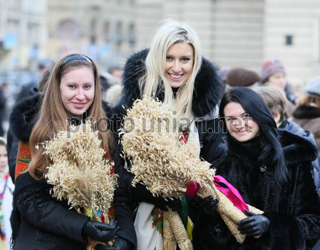 Дівчата тримають різдвяний дідух під час урочистої ходи з різдвяною зіркою, у Львові, у п'ятницю, 6 січня 2012 р. Традиційно 6-го січня у Львові відбувається церемонія встановлення символічного Різдвяного деревця - Дідуха. Висота Дідуха - 6 метрів. Дідух пронесли Львовом колоною, яка складалася з дитячих колективів Львова, посадовців та мешканців міста. Встановили деревце біля будівлі Оперного театру. Фото УНІАН