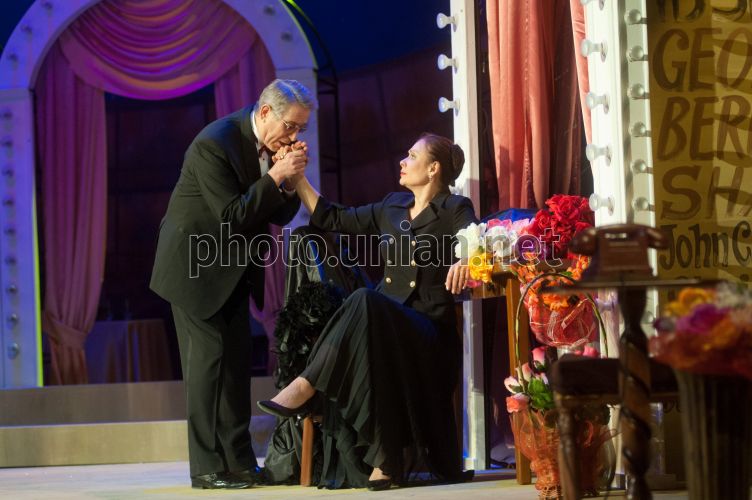 Заслужені артисти України Микола Коновалов та Оксана Туріянська (в ролі актриси Джулії Ламберт) під час спектаклю «Театр», у Запоріжжі, в четвер, 9 лютого 2012 р. У Запоріжжі 10 і 11 лютого відбудеться прем'єра іронічної драми за романом Сомерсета Моема «Театр» («Два життя Джулії Ламберт»). Над постановкою вистави працює головний режисер академічного театру ім. В.Г. Магара заслужений діяч мистецтв України Євген Головатюк. Фото Олександра Прилепи / УНІАН