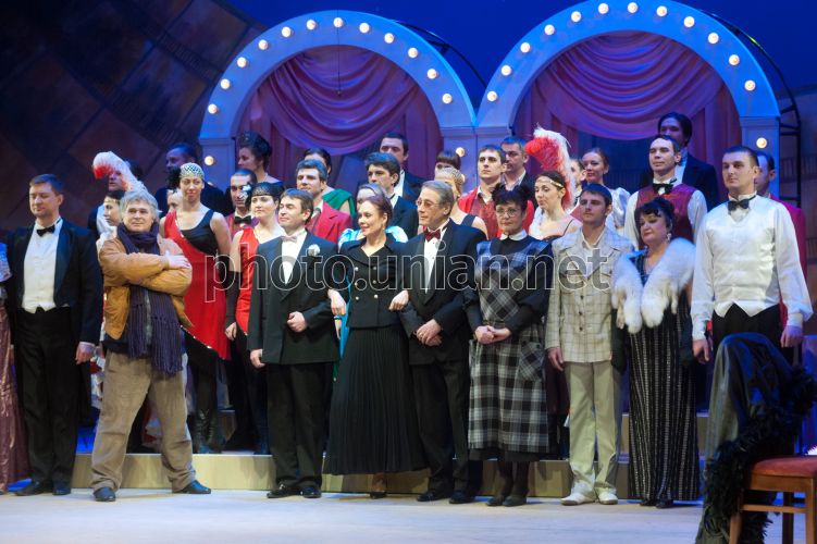 Артисти Запорізького академічного обласного музично-драматичного театру імені В.Г.Магара, у Запоріжжі, в четвер, 9 лютого 2012 р. У Запоріжжі 10 і 11 лютого відбудеться прем'єра іронічної драми за романом Сомерсета Моема «Театр» («Два життя Джулії Ламберт»). Над постановкою вистави працює головний режисер академічного театру ім. В.Г. Магара заслужений діяч мистецтв України Євген Головатюк. Фото Олександра Прилепи / УНІАН