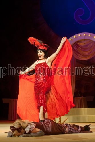 Заслужена артистка України Оксана Туріянська в ролі актриси Джулії Ламберт під час спектаклю «Театр», у Запоріжжі, в четвер, 9 лютого 2012 р. У Запоріжжі 10 і 11 лютого відбудеться прем'єра іронічної драми за романом Сомерсета Моема «Театр» («Два життя Джулії Ламберт»). Над постановкою вистави працює головний режисер академічного театру ім. В.Г. Магара заслужений діяч мистецтв України Євген Головатюк. Фото Олександра Прилепи / УНІАН