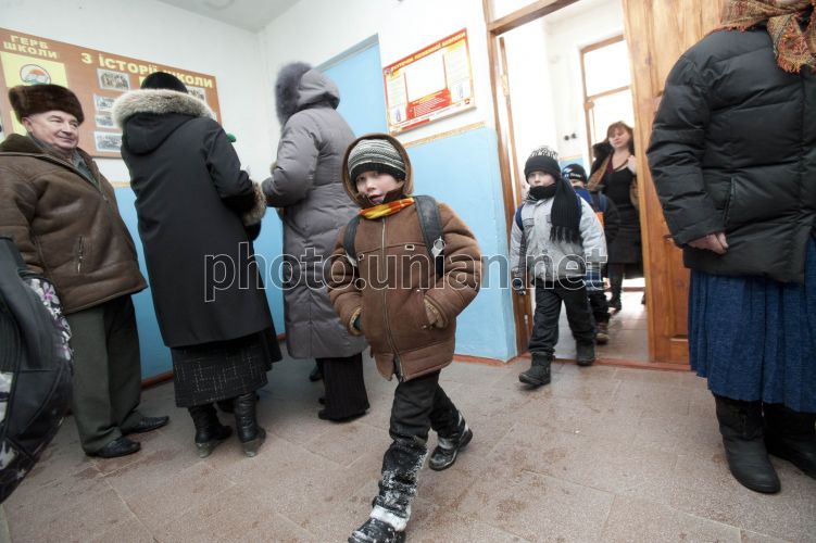 Діти у загальноосвітній школі І-III ступені в с. Барвіновка (Житомирська обл.), у четвер, 16 лютого 2012 р. Цього дня голова ВРУ приїхав в Житомирську обл. з робочою поїздкою. У селі Барвіновка Новоград-Волинського району через велику кількість снігу зруйнувалося 60 кв. м даху учбового корпусу Барвінівської загальноосвітньої середньої школи. За повідомленням прес-служби МНС України, в результаті обвалення ніхто не постраждав. Загроза іншим будівельним конструкціям відсутня. Матеріальні збитки встановлюються. Дана подія на учбовий процес не вплинула. Фото Анастасії Сироткіної / POOL / УНІАН