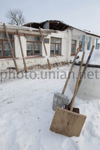 Зруйнована будівля загальноосвітньої школи І-III ступені в с. Барвіновка (Житомирська обл.), у четвер, 16 лютого 2012 р. Цього дня голова ВРУ приїхав в Житомирську обл. з робочою поїздкою. У селі Барвіновка Новоград-Волинського району через велику кількість снігу зруйнувалося 60 кв. м даху учбового корпусу Барвінівської загальноосвітньої середньої школи. За повідомленням прес-служби МНС України, в результаті обвалення ніхто не постраждав. Загроза іншим будівельним конструкціям відсутня. Матеріальні збитки встановлюються. Дана подія на учбовий процес не вплинула. Фото Анастасії Сироткіної / POOL / УНІАН