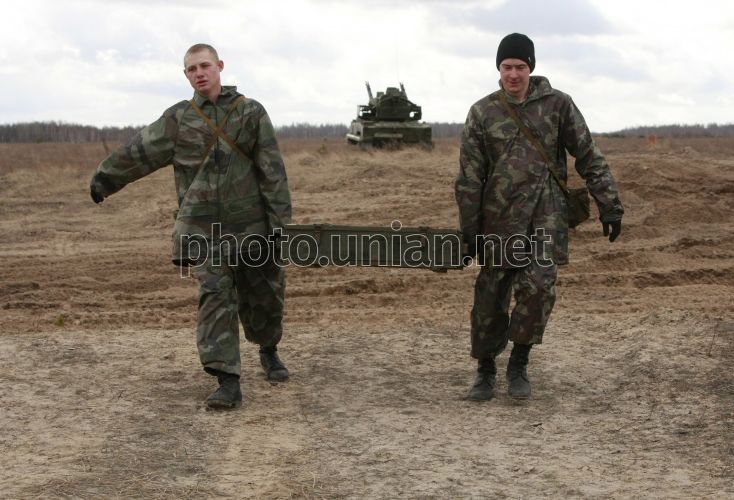 Військовослужбовці несуть набої під час стрільб зенітно-ракетних гарматних комплексів «Тунгуска» в рамках підготовки підрозділів протиповітряної оборони 8-го армійського корпусу Сухопутних військ Збройних Сил України, які залучатимуться до забезпечення безпеки проведення Євро-2012, на полігоні 1-ї окремої танкової бригади, в смт. Гончарівське (Чернігівська обл.), у четвер, 22 березня 2012 р. Фото Володимира Гонтара / УНІАН