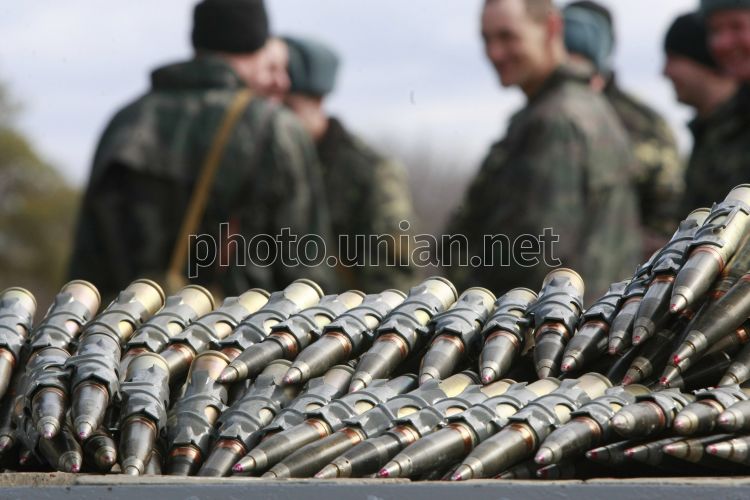 Військовослужбовці готують боєприпаси під час стрільб зенітно-ракетних гарматних комплексів «Тунгуска» в рамках підготовки підрозділів протиповітряної оборони 8-го армійського корпусу Сухопутних військ Збройних Сил України, які залучатимуться до забезпечення безпеки проведення Євро-2012, на полігоні 1-ї окремої танкової бригади, в смт. Гончарівське (Чернігівська обл.), у четвер, 22 березня 2012 р. Фото Володимира Гонтара / УНІАН