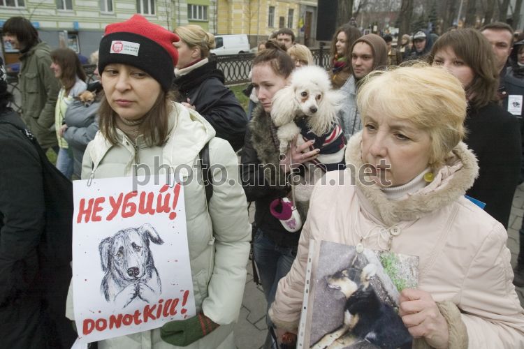 Учасники маршу на захист бездомних тварин тримають плакати, в Києві, в суботу, 31 березня 2012 р. У цей день в Києві пройшов марш на захист бездомних тварин. Акція відбулася в рамках Міжнародного маршу «Fair Play for strays», організованого як протест проти винищення тварин в Україні напередодні Євро-2012. 31 березня захисники тварин і небайдужі громадяни також вийшли на вулиці 15 країн світу, щоб зупинити вбивства бездомних собак і кішок, що здійснюються комунальними службами в Україні під приводом "зачистки території" напередодні Євро 2012. Фото Андрія Скакодуба / УНІАН