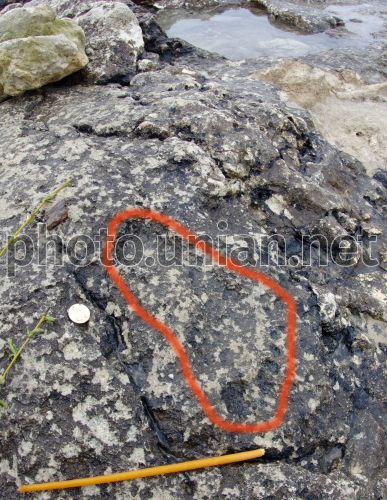 На місці виявлення відбитків видно, що на твердому камені, який не є ні піщаником, ні крейдою, утиснений слід лівої ноги з чітко вираженими пальцями - ніби босою ногою наступили в рідкий цемент або мокрий пісок. Остаточний вердикт про походження слідів може дати геологічна експертиза, яка вже проведена. Її результати стануть відомі через два тижні. Фото Василя Батанова / УНІАН