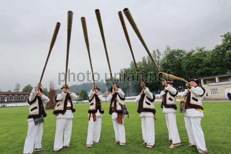 Гуцули грають на трембітах під час традиційного гуцульського свята виходу вівцеводів на гірську долину «Полонінська ватра» в селищі Путіла (Чернівецька обл.), в неділю, 27 травня 2012 р. Цього дня в селищі Путила в 49-те відбулося традиційне гуцульське свято виходу вівчарів на полонини «Полонинська ватра». Ватаг свята (головний вівчар) урочисто відкрив свято «Полонинська ватра» запаленням незмінного атрибуту свята – полонинської ватри (вогнища), що символізувало початок виходу гуцулів на полонину на літування (відгодівлю) вівців у горах. Гостям свята запропонували поринути у світ гуцульської культури і насолодитися театралізованим гуцульським весіллям, а на завершення дійства відбулися народні гуляння та розваги. Фото Сергія Зарайського / УНІАН