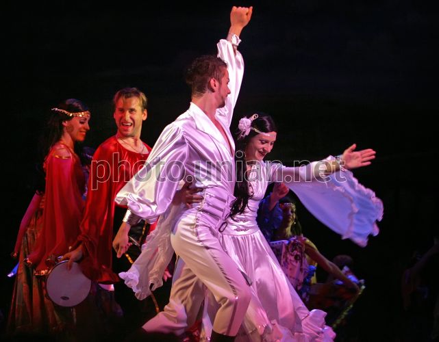Сцена з спектаклю Іоганна Штрауса "Циганський Барон" в постановці Київського національного академічного театру оперети, у четвер, 14 червня 2012 р. У Київському національному академічному театрі оперети представили свою інтерпретацію відомого твору Іоганна Штрауса "Циганський Барон". Вона відрізняється від інших версій великою кількістю музичних і танцювальних номерів, - пояснюють постановники спектаклю. У спектаклі використовується багато складних танцювальних номерів з елементами акробатики. Фото Олександра Синиці / УНІАН