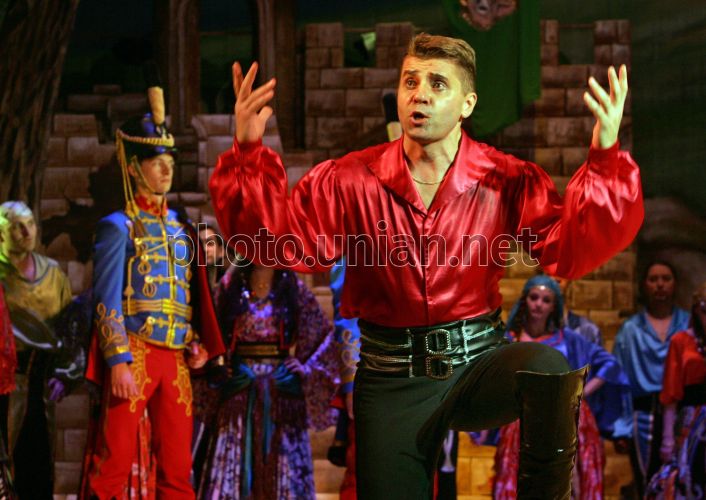 Сцена з спектаклю Іоганна Штрауса "Циганський Барон" в постановці Київського національного академічного театру оперети, у четвер, 14 червня 2012 р. У Київському національному академічному театрі оперети представили свою інтерпретацію відомого твору Іоганна Штрауса "Циганський Барон". Вона відрізняється від інших версій великою кількістю музичних і танцювальних номерів, - пояснюють постановники спектаклю. У спектаклі використовується багато складних танцювальних номерів з елементами акробатики. Фото Олександра Синиці / УНІАН
