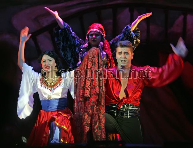 Сцена з спектаклю Іоганна Штрауса "Циганський Барон" в постановці Київського національного академічного театру оперети, у четвер, 14 червня 2012 р. У Київському національному академічному театрі оперети представили свою інтерпретацію відомого твору Іоганна Штрауса "Циганський Барон". Вона відрізняється від інших версій великою кількістю музичних і танцювальних номерів, - пояснюють постановники спектаклю. У спектаклі використовується багато складних танцювальних номерів з елементами акробатики. Фото Олександра Синиці / УНІАН