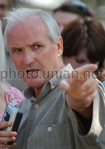 Генеральний директор Національного заповідника "Хортиця" Костянтин Сушко показує гостям скіфські кургани в день відкриття 1-й черги меморіально-туристичного комплексу "Скіфський стан" (Зорева могила) на острові Хортиця недалеко від Запоріжжя у четвер, 10 серпня 2006 р. На Хортиці створюється перший в Україні курганний комплекс "Скіфський стан". У національному заповіднику вирішили відновити десятки унікальних курганів, створених більше п'яти тисяч років тому. Тисячі років тому поховання в кургані на Хортиці вважалося привілеєм вибраних. Стародавні вірили, що курган - це зв'язок людства з Космосом, і підіймалися на високий насип могили предків, щоб спілкуватися з Богом. Кам'яні баби, фалічні і антропоморфні фігури - не просто прикраси курганів. Стародавні наділяли їх містичними властивостями. Втім, кам'яній варті не вдалося уберегти священні місця від варварського грабежу. Із сотень хортицьких могильників збереглося декілька десятків (колись їх було 129, старі з них були насипані в т. з. бронзову еру (3-2 тис. років до нашої ери). Керівництво національного заповідника вирішило відновити кургани, створивши меморіально-етнографічний комплекс.