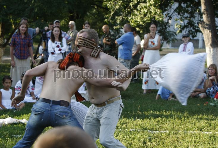 Хлопці б'ються подушками на відкритті свята Перуна в рамках проведення міжнародного фестивалю "Перунів полк" на Києвій горі, у Києві, у п'ятницю, 20 липня 2012 р. Протягом 21 і 22 липня на території Труханова острова у Києві відбудеться міжнародний фестиваль "Перунів полк". Проводиться цей фестиваль з метою вивчення історії, популяризації слов'янської культури і бойових мистецтв, козацьких військових традицій і принципів життя предків. Фото Володимира Гонтара / УНІАН