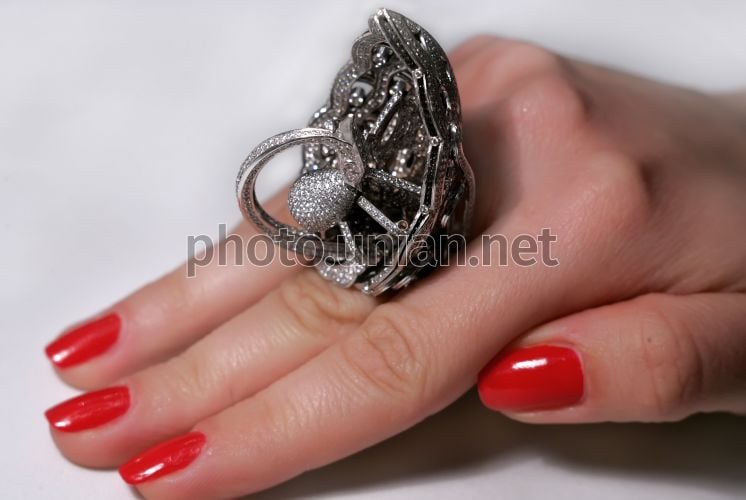 Представник одного з українських ювелірних Домів демонструє перстень «Царівна Лебідь», у Києві, в понеділок, 20 серпня 2012 р. Перстень українських ювелірів потрапив до Книги Рекордів Гіннеса в номінації «Мистецтво» як перстень, в якому закріплена найбільша кількість діамантів – 2525. Прикраса було представлена і виміряна в Києві 21 липня 2011 р. Перстень «Царівна Лебідь» виготовлено з 18-каратного білого золота і прикрашено 2525 діамантами загальною вагою 10,48 карата. Проектування і розробка дизайну зайняли близько 530 годин, а для його виготовлення знадобилося ще 3625 годин роботи. В ювелірному Домі розповіли, що натхнення вони черпали з картини Врубеля «Царівна Лебідь». Фото Олександра Синиці / УНІАН