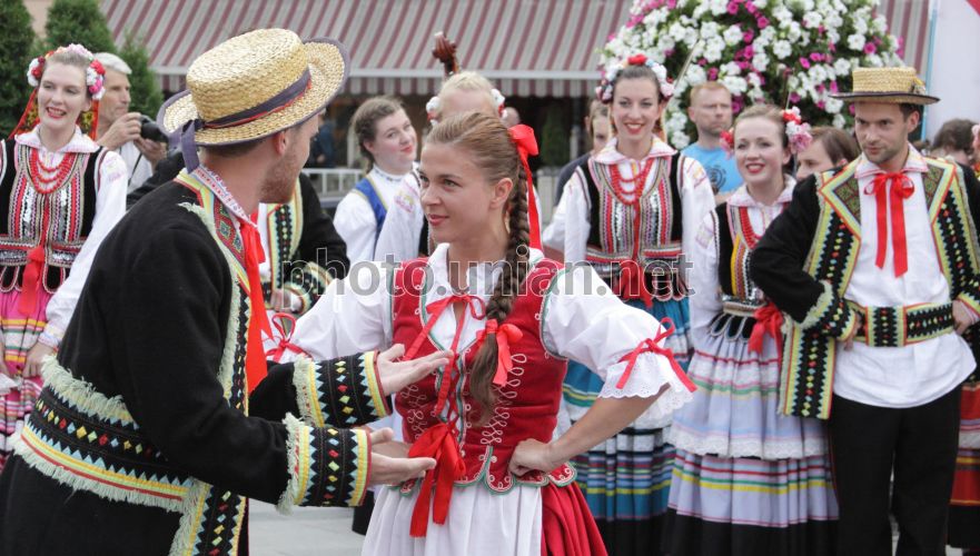 Учасники Міжнародного фестивалю фольклору «Етновир» на площі Ринок, у Львові, у середу, 22 серпня 2012 р. Міжнародний фестиваль фольклору «Етновир» проходитиме у Львові з 22 по 26 серпня 2012 року. Кожен колектив, окрім фольклору, представить ще й кухню своєї країни. Прямо на площі Ринок можна буде спробувати страви іспанської, турецької, польської, білоруської та інших кухонь. Фото Вадима Голуба / УНІАН