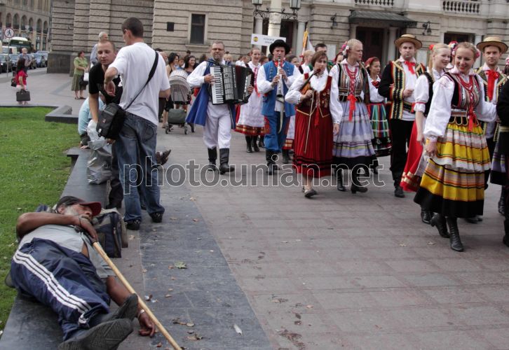 Учасники Міжнародного фестивалю фольклору «Етновир» під час параду, у Львові, у середу, 22 серпня 2012 р. Міжнародний фестиваль фольклору «Етновир» проходитиме у Львові з 22 по 26 серпня 2012 року. Кожен колектив, окрім фольклору, представить ще й кухню своєї країни. Прямо на площі Ринок можна буде спробувати страви іспанської, турецької, польської, білоруської та інших кухонь. Фото Вадима Голуба / УНІАН