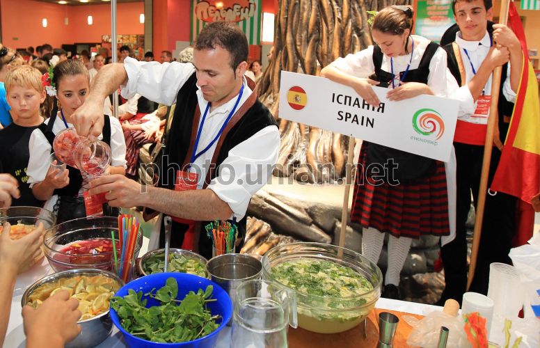 Представник Іспанії частує відвідувачів національними напоями під час Міжнародного фестивалю фольклору «Етновир», у Львові, у п'ятницю, 24 серпня 2012 р. Міжнародний фестиваль фольклору «Етновир» проходитить у Львові з 22 по 26 серпня 2012 року. Кожен колектив, окрім фольклору, представить ще й кухню своєї країни. Прямо на площі Ринок можна буде спробувати страви іспанської, турецької, польської, білоруської та інших кухонь. Фото Євгенія Кравса / УНІАН