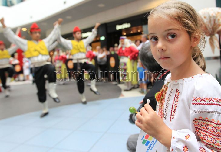 Дівчинка під час Міжнародного фестивалю фольклору «Етновир», у Львові, у п'ятницю, 24 серпня 2012 р. Міжнародний фестиваль фольклору «Етновир» проходитить у Львові з 22 по 26 серпня 2012 року. Кожен колектив, окрім фольклору, представить ще й кухню своєї країни. Прямо на площі Ринок можна буде спробувати страви іспанської, турецької, польської, білоруської та інших кухонь. Фото Євгенія Кравса / УНІАН