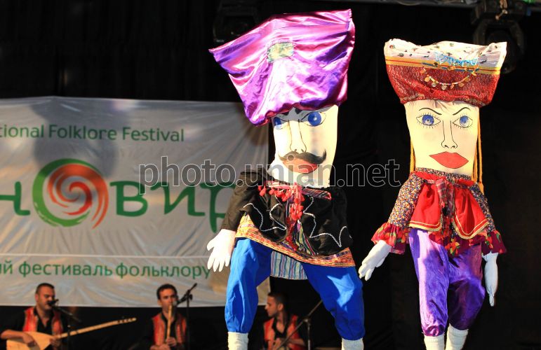 Представники Туреччини в костюмах султана і його дружини під час гала-концерту на Міжнародному фестивалі фольклору «Етновир», у Львові, у неділю, 26 серпня 2012 р. Міжнародний фестиваль фольклору «Етновир» проходитить у Львові з 22 по 26 серпня 2012 року. Кожен колектив, окрім фольклору, представить ще й кухню своєї країни. Прямо на площі Ринок можна буде спробувати страви іспанської, турецької, польської, білоруської та інших кухонь. Фото Євгенія Кравса / УНІАН