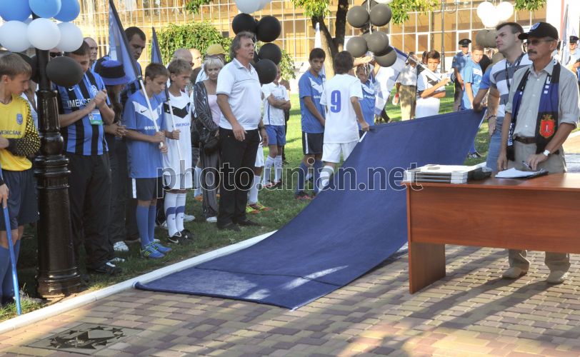 Учасники відкриття Алеї слави ФК "Чорноморець" в Одесі, у суботу, 1 вересня 2012 р. Цього дня біля стадіону «Чорноморець» в Одесі була відкрита Алея футбольної слави. На алеї з'явилося 12 зірок. 11 - іменні, а одна зірка присвячена «12-му гравцю» - відданим уболівальникам «Чорноморця». Фото Максима Войтенка / УНІАН
