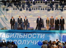 Лідер Партії регіонів, прем'єр-міністр України Микола Азаров (в центрі) виступає під час зустрічі з виборцями в Миколаєві, у п'ятницю, 12 жовтня 2012 р. Лідер Партії регіонів, прем'єр-міністр України Микола Азаров цього дня узяв одноденну відпустку для спілкування з виборцями у Миколаївській області. Під час поїздки до Миколаєва Азаров ознайомився з ходом реконструкції скверу "Пролетарський" і роботою дитячого спортивного містечка. Крім того, лідер Партії регіонів дав інтерв'ю Миколаївській обласній телерадіокомпанії і поспілкувався з партійним активом Миколаєва. Фото Олега Маркевича / POOL / УНІАН