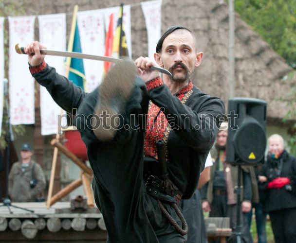 Козак Печерської сотні реєстрового козацтва під орудою курінного отамана Олександра Харченка із шаблею в козацькому селищі "Мамаєва Слобода", в Києві, у неділю, 14 жовтня 2012 р. Показовий виступ пройшов у рамках козацького свята «Гей, вернися, Сагайдачний!», присвяченого святу Покрови Пресвятої Богородиці. Фото Бориса Закалюка / УНІАН