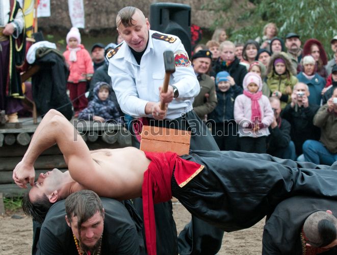 Козаки під час народних гулянь із відтворенням давніх козацьких забав у козацькому селищі "Мамаєва Слобода", в Києві, у неділю, 14 жовтня 2012 р. Показовий виступ пройшов у рамках козацького свята «Гей, вернися, Сагайдачний!», присвяченого святу Покрови Пресвятої Богородиці. Фото Бориса Закалюка / УНІАН