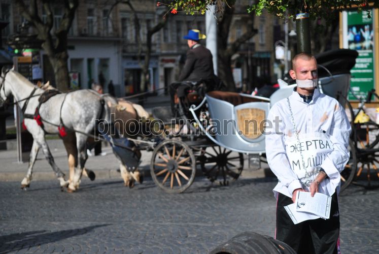 Молодий чоловік з табличкою "Жертва міліції" прикував себе ланцюгом до стовпа у знак протесту проти свавілля міліції у Львові, в неділю, 4 листопада 2012 р. Цього дня у Львові молодий чоловік прикував себе ланцюгом до стовпа у знак протесту проти свавілля міліції. Прикований ланцюгами хлопець був одягнений у білу сорочку із написом «Жертва міліції», а на обличчі мав намальовані синці начебто від побоїв. Учасники акції роздавали перехожим листівки, де йшлося про події на 132-му виборчому окрузі в Первомайську. Фото Валерія Шмакова / УНІАН