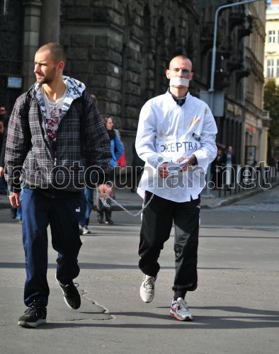 Молодий чоловік з табличкою "Жертва міліції" під час акції проти свавілля міліції у Львові, в неділю, 4 листопада 2012 р. Цього дня у Львові молодий чоловік прикував себе ланцюгом до стовпа у знак протесту проти свавілля міліції. Прикований ланцюгами хлопець був одягнений у білу сорочку із написом «Жертва міліції», а на обличчі мав намальовані синці начебто від побоїв. Учасники акції роздавали перехожим листівки, де йшлося про події на 132-му виборчому окрузі в Первомайську. Фото Валерія Шмакова / УНІАН