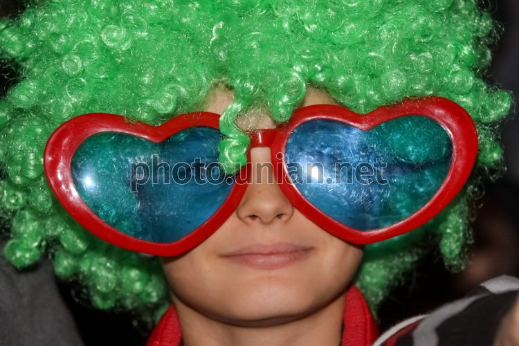 Глядачка в червоних окулярах і зеленій перуці під час виступу американського денс хіп-хоп дуету LMFAO в Києві, у п'ятницю, 7 грудня 2012 р. У цей день в столиці пройшов перший концерт популярного танцювального дуету в Україні. Фото Вальдемара Горлушко / УНІАН
